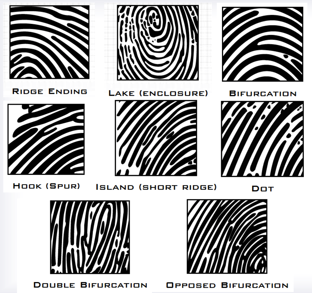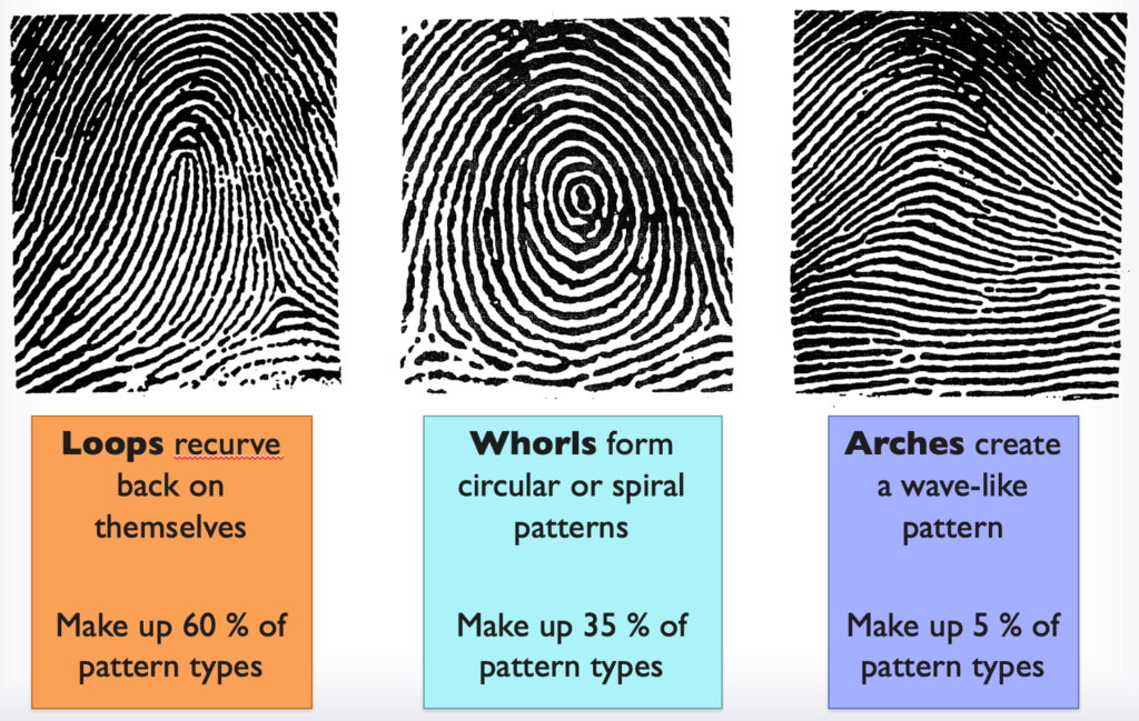 Many techniques have been used, including DNA sequences, skeletal features, iris patterns in the eye, voice patterns, palm prints, and facial patterns, but today, we are probably most familiar with the use of fingerprints for this purpose. A fingerprint is a unique pattern of friction ridges that forms on the fingers of an embryo during the early weeks of gestation. Because these ridges develop differently for everyone, no two people have exactly the same fingerprint pattern – not even identical twins.