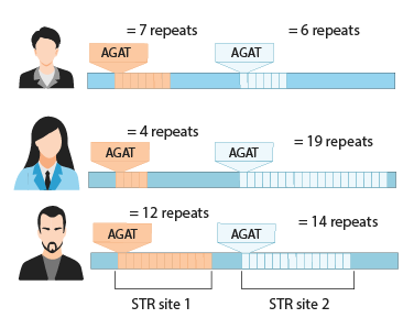 Some bodily fluids contain sufficient information to gain a DNA comparison, which can be crucial in identifying victims and suspects. The DNA molecule is the molecule of heredity that is passed from parents to offspring. DNA can be used as a molecular identification tag when subjected to the process of DNA fingerprinting. This is based on the fact that different people will always have different DNA sequences, unless they are identical twins. Scientists can compare sequences in the human genome that vary from person to person, for example repeated DNA sequences known as short tandem repeats (STRs). Each person has two alleles at each STR site, and there are dozens of forms (alleles of different lengths) of these repeating segments. The chance of two people randomly having the same two alleles is very small, and can be used to make identification of victims or suspects.